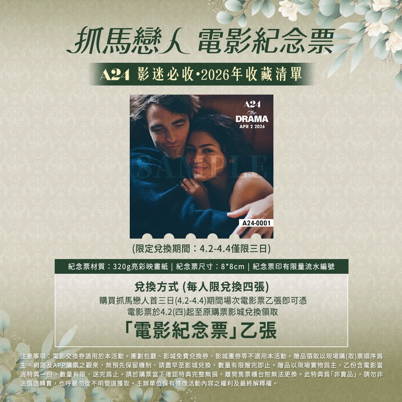📌兌換方式:購買抓馬戀人首三日(4/2-4/4)期間場次電影票乙張,即可憑電影票於4/2(四)起至原購票影城兌換領取「電影紀念票」乙張, 每人限兌換四張。
