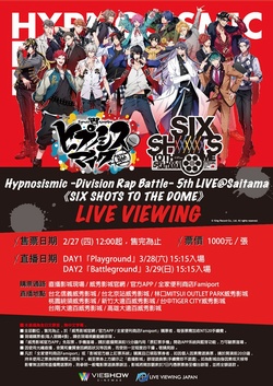2020年3月28日(六)、29日(日)於日本琦玉縣 大都會人壽巨蛋(西武巨蛋) 舉辦的Hypnosismic –Division Rap Battle- 5th LIVE@Saitama《SIX SHOTS TO THE DOME》已經確定進行為期2日的現場直播。 與上屆相同分別以DAY1《Playground》,DAY2《Battleground》登場,兩天亦將安排不同主題的歌曲,獻上不同內容的Rap Battle! 除了先前發表的池袋、橫濱、涉谷、新宿四組人馬12位聲優外,這回還加入了新誕生的大阪、名古屋陣容,全部卡司將齊聚一堂,上演Hypnosismic史上陣容最龐大的2日Live演出。也確定將於日本全國、香港、韓國、泰國及新加坡各地的電影院中進行現場直播。
