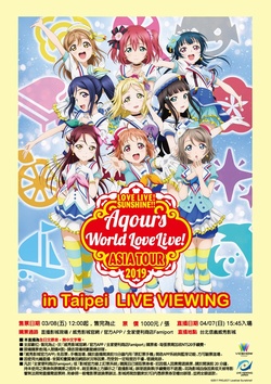 於2019年3月24日(日)上海·上海國家會展中心虹館EH,2019年4月7日(日)台北·台北國際會議中心(TICC)和2019年4月21日(日)首爾·高麗大學化汀體育館舉辦的Aqours全長演唱會的首次亞洲巡演《LOVE LIVE! SUNSHINE!! Aqours World LoveLive! ASIA TOUR 2019》已確定向日本全國及海外的電影院進行現場直播。