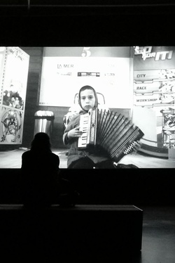 鏡頭對準在購物賣場演奏著手風琴的小男孩,導演