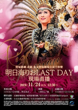 2019年11月24日(日)寶塚歌劇 花組Top Star明日海りお(Rio Asumi)的退團公演,三井住友VISA卡劇場Musical 『A Fairy Tale -藍玫瑰精靈-』、三井住友VISA卡劇場 Revue Romance 『Charme!』的東京寶塚劇場千秋樂,將於日本、香港、台灣的電影院舉行現場直播。