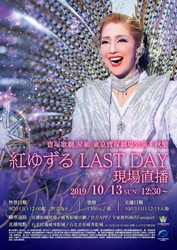 2019年10月13日(日)寶塚歌劇 星組Top Star 紅ゆずる(Yuzuru Kurenai)的退團公演,音樂劇豪華全餐 『GOD OF STARS-食聖-』、太空歌舞秀幻想 『Éclair Brillant』東京寶塚劇場千秋樂,將於日本、香港、台灣的電影院舉行現場直播。