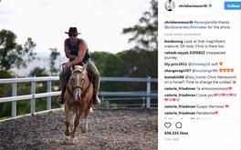 2017/12/29 台灣上映 克里斯漢斯沃《12猛漢》中飾演「綠扁帽」特種部隊隊長,在險峻山區騎馬馳騁戰場。而他私下也是一名騎馬好手,聖誕假期返回澳洲與親友共度的他在IG上傳一張騎馬照,讓粉絲心花怒放,紛紛留言熱情告白:「誰騎馬能比他帥」。