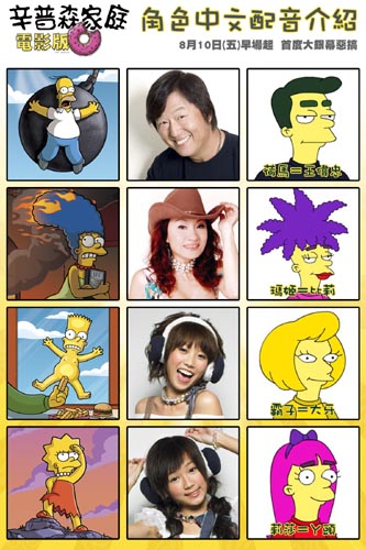 《辛普森家庭電影版》中文版辛光幫成員︰王偉忠配荷馬、比莉配瑪姬、大牙反串小男生配霸子、聲音辨識度高的Y頭則配莉莎。製作「超級星光大道」的偉忠哥表示有了該節目的經驗又配又唱完全沒問題;大牙反串霸子被笑聲磨到快昏倒,比上次的企鵝還難配;Y頭為了揣摩莉莎的初戀,用童音施展媚力,自嘲配音初體驗;至於比莉首度為好萊塢動畫配音,一度在錄音室配到落淚,深感片中丈夫荷馬是沒有用的男人的比莉,推薦《辛普森家庭電影版》給所有女性觀眾。為求品質,福斯總公司並有聲音指導來台提供全程協助,他表示中文版是他此次巡迴行程中聽過最精采的版本,對這次中文版辛光幫成員推崇備至。