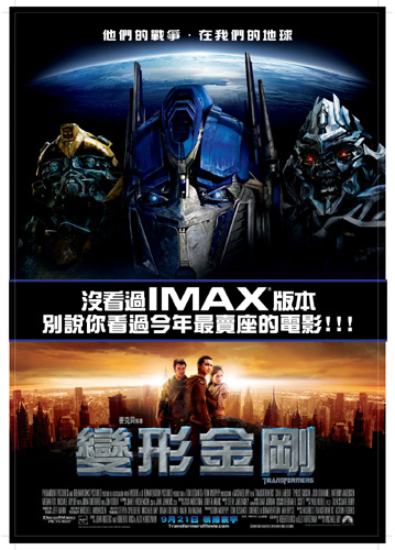 派拉蒙電影公司日前鄭重宣布,台灣將和美國同步,於9月21日起在美麗華大直影城IMAX影廳隆重推出,《變形金剛》IMAX版本。