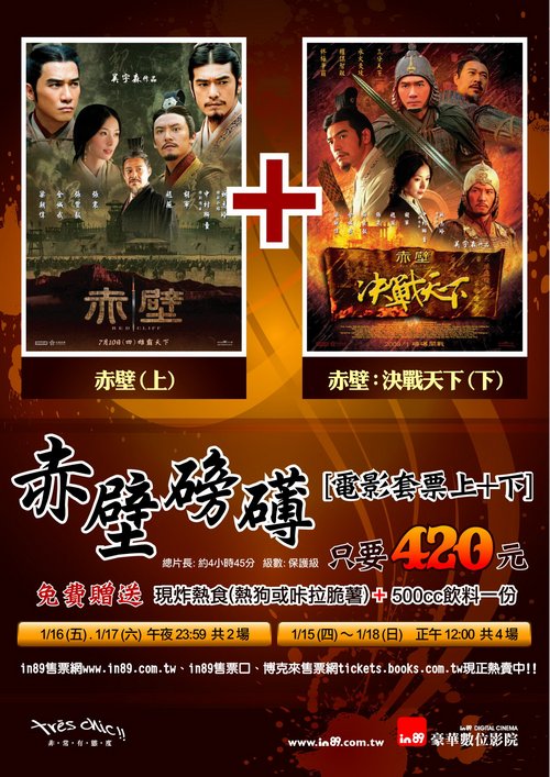 赤壁磅礡套票:赤壁(上)+ 赤壁:決戰天下(下)只要420元,免費贈送現炸熱食(熱狗或?拉脆薯)+500cc飲料一份!