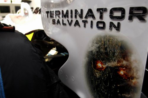 這是新力影業與F1繼阿諾在2003年英國大獎賽上現身宣傳《魔鬼終結者3》之後的再度攜手合作。為了替Brawn GP在西班牙加泰隆尼亞賽道造勢,現場除了有《魔鬼終結者:未來救贖》專屬F1賽車曝光外,在《魔鬼終結者:未來救贖》戲份吃重的T600原形終結者也出現在現場,與Brawn GP車手傑森-巴頓 (Jenson Button) 和魯本-巴里切羅 (Rubens Barrichello) 合照,甚至連車隊的修理站都以《魔鬼終結者:未來救贖》做為主題佈置背景。