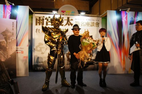 隨著【牙狼】系列最新電影版《牙狼~蒼哭魔龍~》即將在台上映,群英社在下午舉辦了一場雨宮慶太的簽名座談會,讓眾多的牙狼迷可以和憧憬的大師來一場近距離會談。主辦單位特地從日本邀請到在【牙狼】系列中參與演出的動作演員和田三四郎穿戴黃金騎士鎧甲現身,以及打扮成?島鋼牙劇中造型的Coser登場演出武打動作,為現場增添了不少熱情的氣氛,也讓忠實的影迷們直呼太帥氣了!