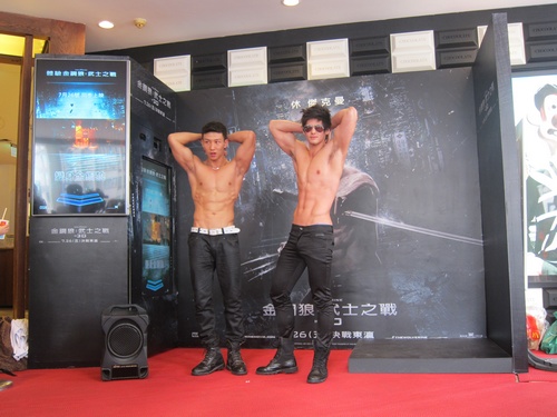 化身金鋼狼,必先練好使用鋼爪的基本功,今天下午在新光三越南西店三館出現一群扮裝成金鋼狼招牌白背心加上牛仔褲的猛男,在現場為熱情圍觀的民眾們示範如何化身金鋼狼。只要站入《金鋼狼:武士之戰》電影專屬Kinet體感裝置的遊戲區後,機器將會自動感應您的雙手,螢幕上顯示您正在高速行駛中的新幹線車頂,前方有許多障礙物阻撓您的前進,但只要適時的揮舞雙手,便可輕鬆除去障礙物抵達終點!