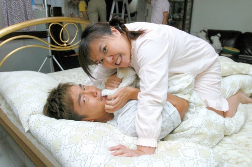 從未在戲中跟男人這麼近距離接觸的美秀,此次有機會磨蹭青春的肉體,也讓她開心不已!「這是我第一次拍床戲,很親密、躺在沛旭的胳肢窩很舒服,也有小露玉腿,但不會尷尬,我們非常自然的完成年長版的偶像劇情節」美秀開心的說著。而李沛旭六年前演出緯來電視電影『誰搞鬼上身』與鍾欣凌飾演夫妻,兩人在劇中也是有場搞笑的床戲,甚至笑說自己被鍾欣凌泰山壓頂!而六年後接演《黑道上錯身》,因與小彬彬互換靈魂,與美秀間接有了床戲,同樣被美秀泰山壓頂的他,搞笑露出死魚眼,連一旁裝睡的小小彬都忍不住笑場。