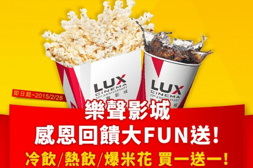 內容:活動期間至樂聲影城現場販賣部,購買任一餐點或飲料*,即享買一送一優惠!