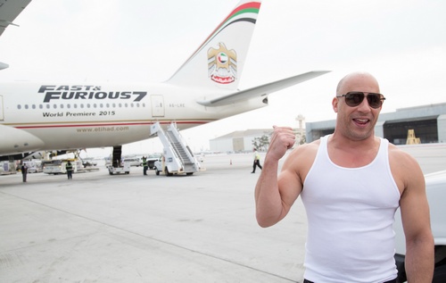環球電影公司特別和阿提哈德航空首度合作,打造全球唯一一架命名為「玩命關頭7」的波音777客艙(阿提哈德航空171),並於美國時間3月18日(星期三)由《玩命關頭》系列主角馮迪索在洛杉磯機場迎接首航