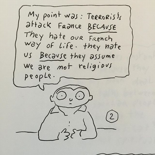 2.我的重點在於:那些攻怖份子攻擊巴黎,是因為他們討厭我們法國人的生活方式,他們認為我們不是宗教份子。