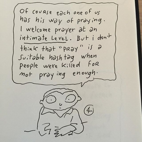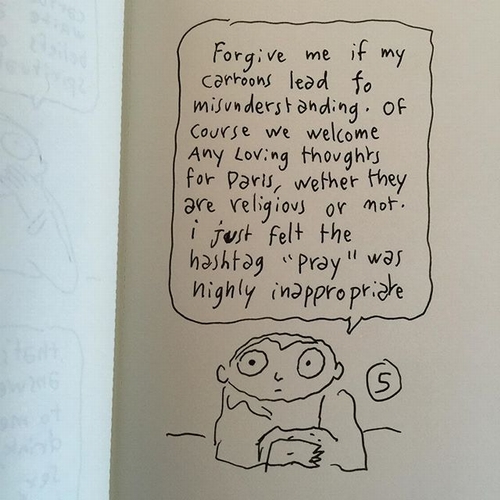5.原諒我的漫畫造成誤解,我們當然歡迎那些給巴黎的愛的想法,無論這是否關係到宗教,我只是認為”祈禱”這個標籤有些不適當