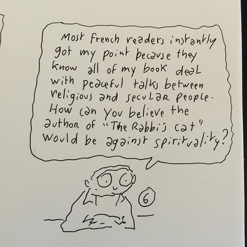 6.大部分的法國讀者很快就能懂我的點,因為他們熟知我書裡那些關於宗教世俗的和平言論,你怎麼會相信”The Rabbit cat”的作者會反對人道精神