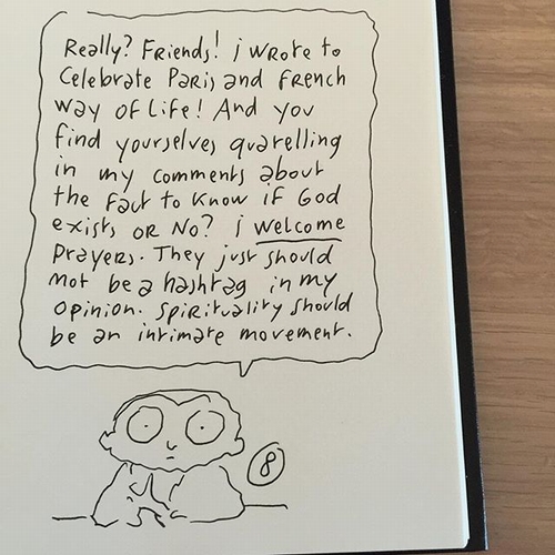8.朋友們!我書寫關於巴黎和法國的生活態度,而你卻在我的言論中質疑上帝存在與否?我歡迎祈禱者們,我只是認為那不該是個標籤,這精神應該展現在相愛人們的行為間