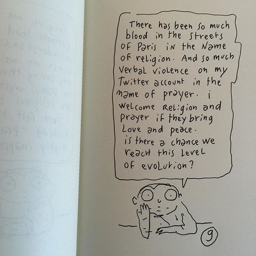 9.在巴黎的街上已經染上太多以宗教為名的鮮血,太多言語的暴力充斥在我關於祈禱的推特發文上,我歡迎那些帶著愛與和平的宗教祈禱,我們有機會進展到這樣的層面嗎?