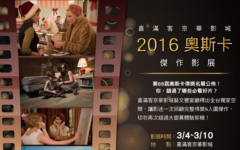 2016年第88屆奧斯卡得主出爐後,各影城皆湧現觀影人潮,部分已下檔好片詢問不斷。喜滿客京華影城應觀眾要求,廣邀本屆奧斯卡入圍/得獎傑作,將於3/4至3/10隆重推出「奧斯卡傑作影展」。