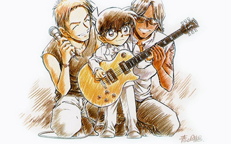 而B’z與柯南的相遇,其實是因為《名偵探柯南》原著青山剛昌老師自身就是B’z死忠歌迷,也促成了彼此合作的契機,青山剛昌老師更為此手繪了一張圖作為特別紀念。其後每逢重大作品出爐,便一定會使用B’z樂團的創作歌曲,如劇場版第10彈、第15彈,以及今年所推出的第20彈《名偵探柯南:純黑的惡夢》。