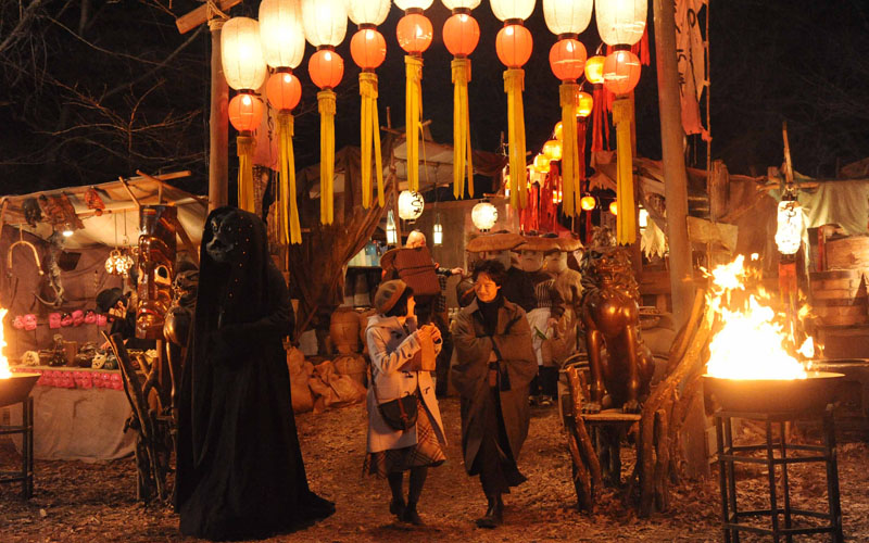 為了打造《鎌倉物語》既奇幻卻又讓人感到真實的世界觀,劇組盡可能實景拍攝,像是群馬縣的澀川天空遊樂園、高崎市的居酒屋等,但有些場景會做搭景搭配視覺特效來製作,最令人印象深刻的就是男女主角在鎌倉魔界市集閒逛,還買了魔界松茸的場景,吊滿絢爛豪華的燈籠,充滿未知的古怪食物與雜貨店的這個空間,讓人宛如踏進了異世界,沒想到台灣夜市就是成為導演打造這個魔幻市集的靈感之一!