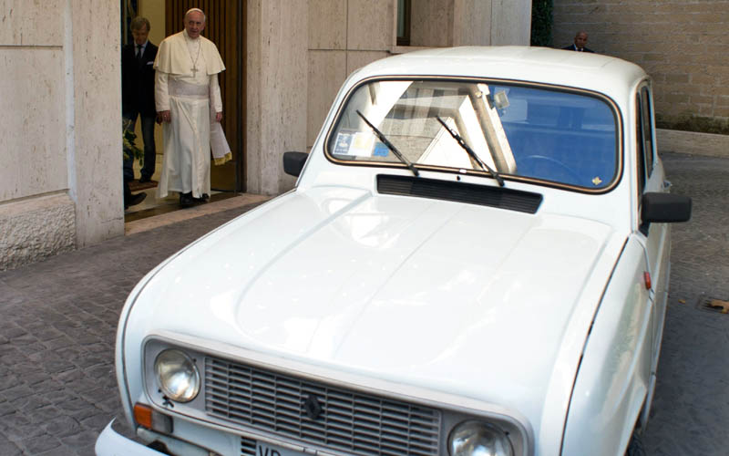 教宗的愛車「雷諾4型」不僅是國民車款,更是使用超過30年的二手老車。這輛車原先是義大利神父倫佐佐卡(Don Renzo Zocca)開了34年、跑遍義北教區行善的傳教車,就在教宗方濟各就任時,被當作禮物送進梵蒂岡,受到教宗喜愛程度,遠勝過任何藝術珍品。