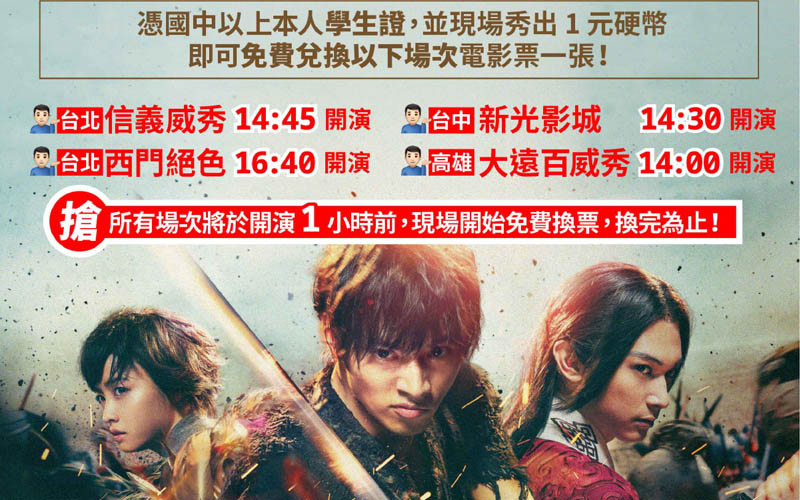活動辦法:7/13(六)本人憑國中(含)以上學生證,並現場秀出一元,一張學生證即可兌換一張以下指定戲院指定場次電影票乙張,開演前一小時於戲院現場開始排隊取票,座位有限,換完為止!