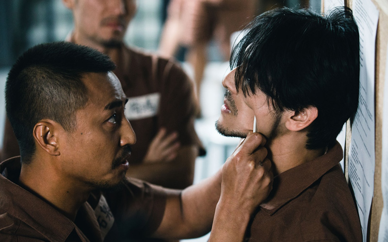 栢天男又被另一個獄中大哥譚耀文盯上,直接抓著他上演胸口碎木板的戲碼,在他胸上放上木板,直接以大鐵槌大力敲下去,奮力的砸了好幾下。譚耀文表示打人比被打的壓力更大,「我真的很怕木板會裂開,我會直接砸到他的胸口,或是太大力敲到他內傷。但不夠力又不好看,幸好武術指導有經驗,栢天男也配合得好,終於完成這場戲。」栢天男也承認當下被打一下就會驚嚇一次,「但譚哥很照顧我,所以不會太害怕。」