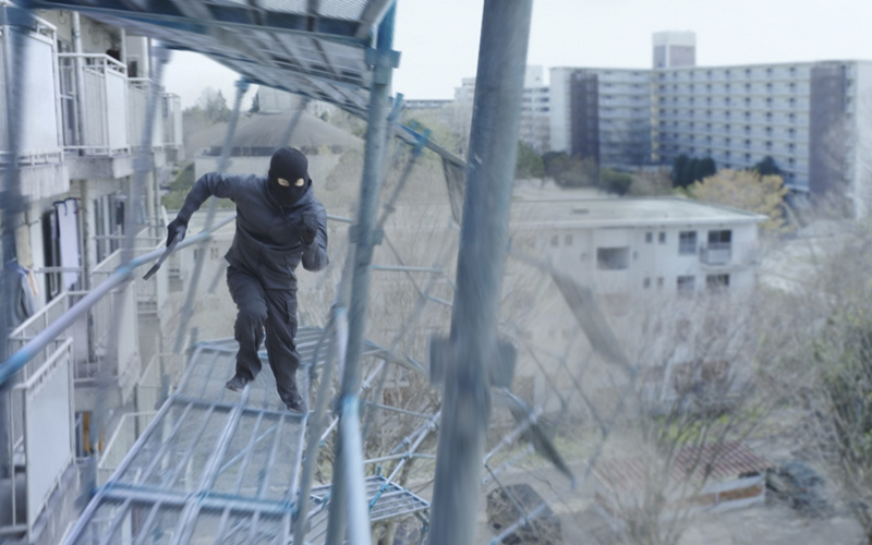 尤其只綁著一條救生索的岡田,以及飾演敵手的動作演員們,必須在狹窄的空間內一面急速落下、一面打鬥,完成這一連串超刺激場面。據悉,這場戲其中一位飾演敵手的動作演員,正是岡田的柔術師父橋本知之;而岡田對這場面也貌似小菜一疊,更在拍攝空檔一臉自在地靠在鷹架上毫無恐懼,展現胸有成竹的姿態,讓人印象深刻。
