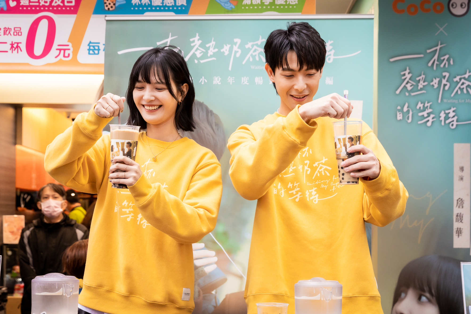 連晨翔、吳子霏今天(18日)也特別在寒冷的天氣送溫暖的奶茶給粉絲,攜手來到CoCo西門店擔任一日店長,粉絲一早九點不畏寒風低溫,店門沒開就來排隊,就為了跟偶像近距離見面拿簽名海報,兩位演員還特別為親調珍珠奶茶給三位透過網路活動中獎的幸運粉絲,吳子霏因為太過緊張不小心灑出飲料成了意外插曲,笑說:「代表電影會大發,我平常喜歡喝手搖,沒想到每個步驟這麼辛苦,真的要向飲料店工作人員致敬」,連晨翔為了減輕吳子霏弄灑飲料的緊張還開玩笑要她賠桌布弄髒的清洗費,逗笑吳子霏反擊:「我會賠」,同樣是手搖飲的愛好者,連晨翔分享:「以前最愛揪兄弟喝CoCo的奶茶三兄弟,而且到法國旅行,看到CoCo也一定要喝,在國外品嘗台灣味」,而在戲中有不少撩妹橋段的連晨翔被要求秀一下,他特別挑中一位幸運粉絲問她飲料喝幾分甜,並且開撩:「我覺得你飲料要喝無糖,因為妳長得夠甜」撩得粉絲不要不要。