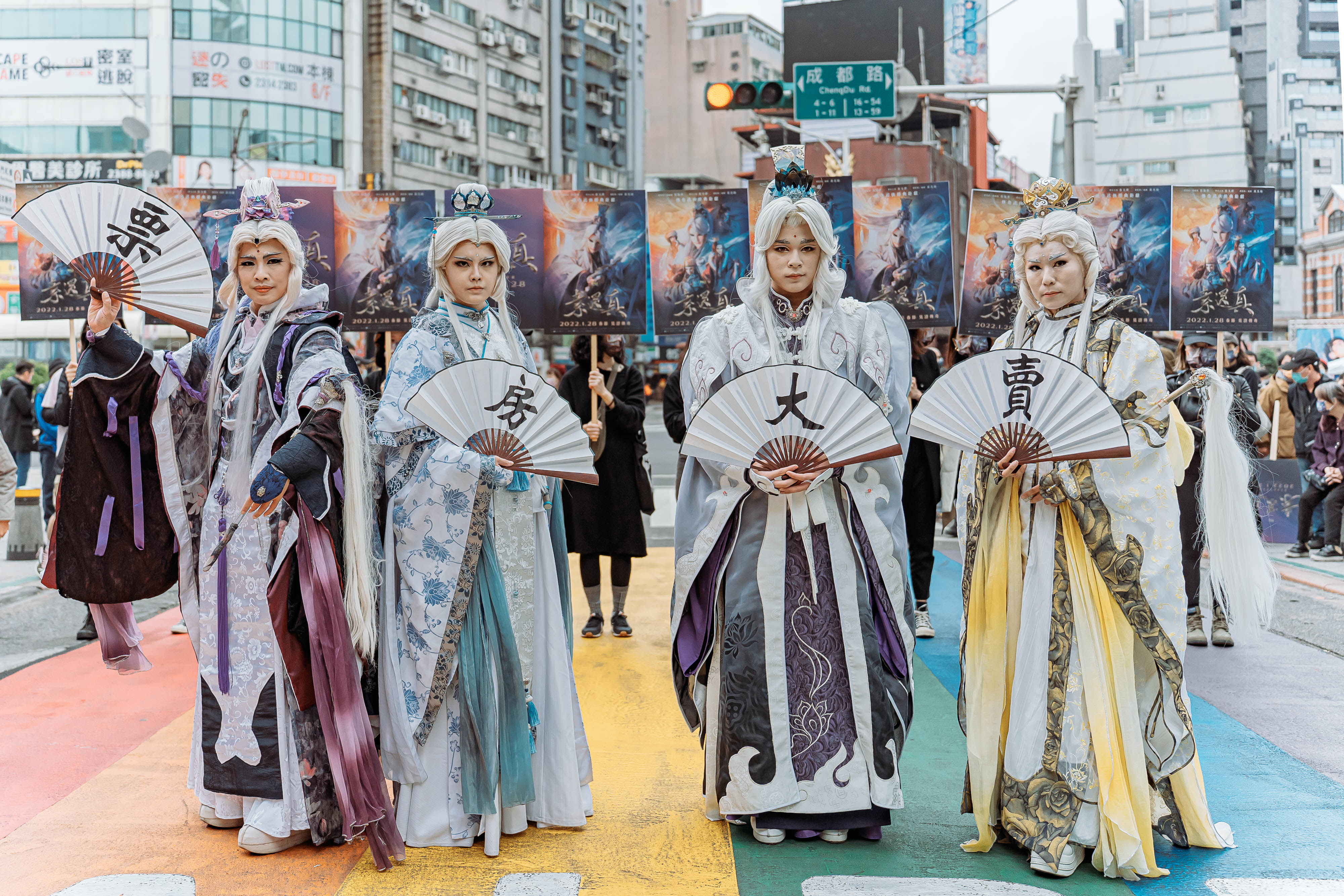 今(9)日在西門町舉辦快閃踩街活動,邀請到4位Coser扮演「霹靂一哥」素還真的四個經典時期,也包含這次全新電影《素還真》片中的年少時期的素雅造型,並沿街發送口罩與紅包袋等贈品,引發民眾熱烈搶拍圍觀。除了賀歲踩街外,四位Coser還在街頭進行快閃表演,結束後更親切地與粉絲們一一合照。