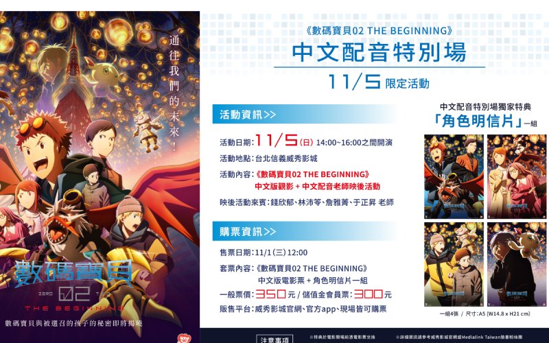 為了回應廣大觀眾的熱情,負責發行的羚邦公司特別在本周日(11/5)下午14:00~16:00邀集多位為人物配音的老師於信義威秀舉辦「中文配音特別場」與粉絲們見面:包括「大和田類」的錢欣郁老師、「烏科獸」的林沛笭老師、「V仔獸/高石武」的詹雅菁老師以及負責旁白、「一乘寺賢/麻鷹獸」的于正昇老師,舉辦一場中文配音特別場,並提供四張一組的獨家特典:角色明信片(尺寸: A5 14.8X21 CM),預售票將於11/1(週三)中午12:00開賣,每張票價350元,數量有限,售完為止,真正物超所值!