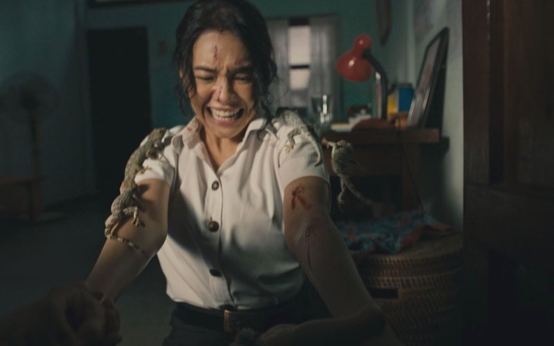 《邪降:覺醒》講述出生自帶詛咒的「潘娜」,原想在大學重啟新生,卻慘遭六名學長姐的霸凌與降術迫害,進而激發體內埋藏的強大邪力,變身冷血獵人展開血腥殺戮。飾演潘娜的泰國人氣女星丘普朗阿瑞昆(Cherprang Areekul)此次再度回歸邪降宇宙,拚命程度更勝以往。一場與數十隻大壁虎(又稱大守宮)近距離對戲的戲碼中,一隻大壁虎在飼養員鬆口的瞬間情緒失控,轉頭狠咬丘普朗,當場留下清晰齒痕與血跡。