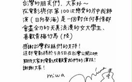 2017/05/02 台灣上映 《與妳的第100次愛戀》坂口與miwa聽聞本片即將在台上映,也特地書寫文字留言向台灣影迷催票;不黯中文的miwa甚至特別做功課,通篇用中文寫下對台灣影迷的感謝,展現高度誠意。