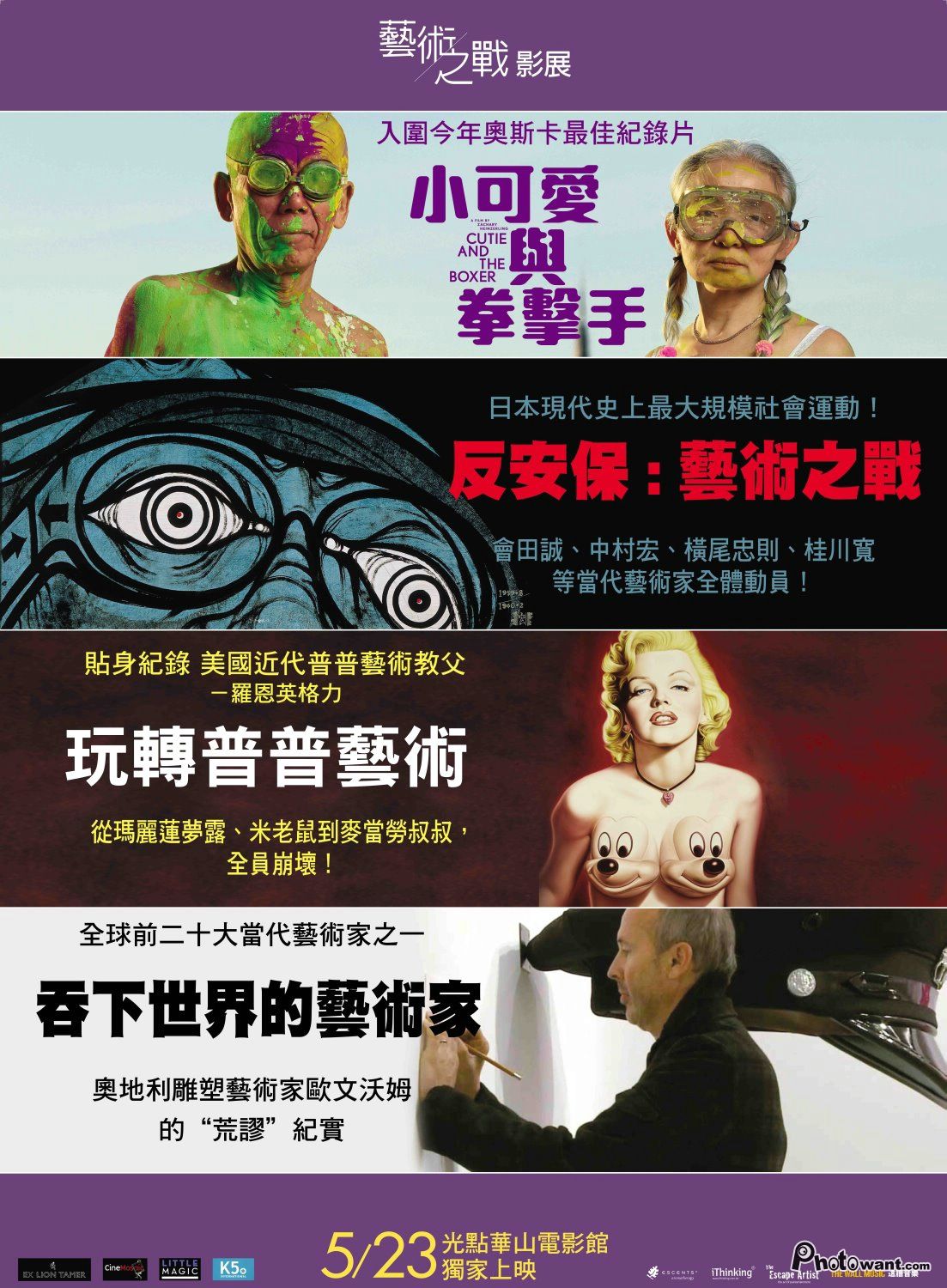 入圍今年奧斯卡最佳紀錄片《小可愛與拳擊手》、史無前例,佔領國會!《反安保:藝術之戰》、專門搞破壞的小丑!《玩轉普普藝術》、奧地利雕塑藝術家歐文沃姆的”荒謬”紀實《吞下世界的藝術家》。