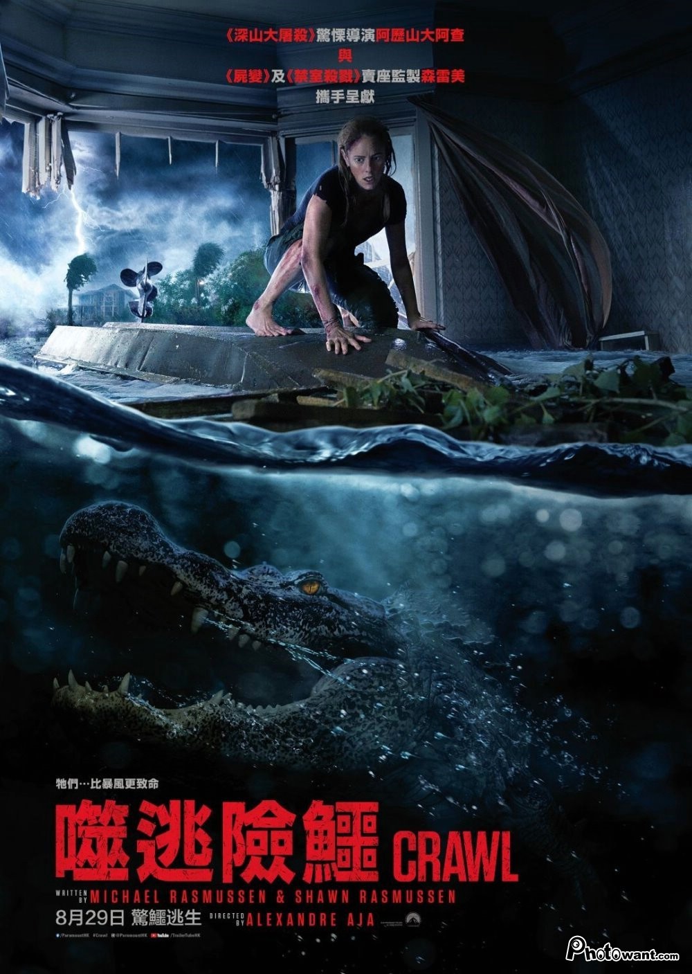 導演亞歷山大阿甲恐怖驚悚片。強大的颶風襲擊佛羅里達州,影響他們最可怕的並不是上漲的水位,而是隱藏在水中的生物。