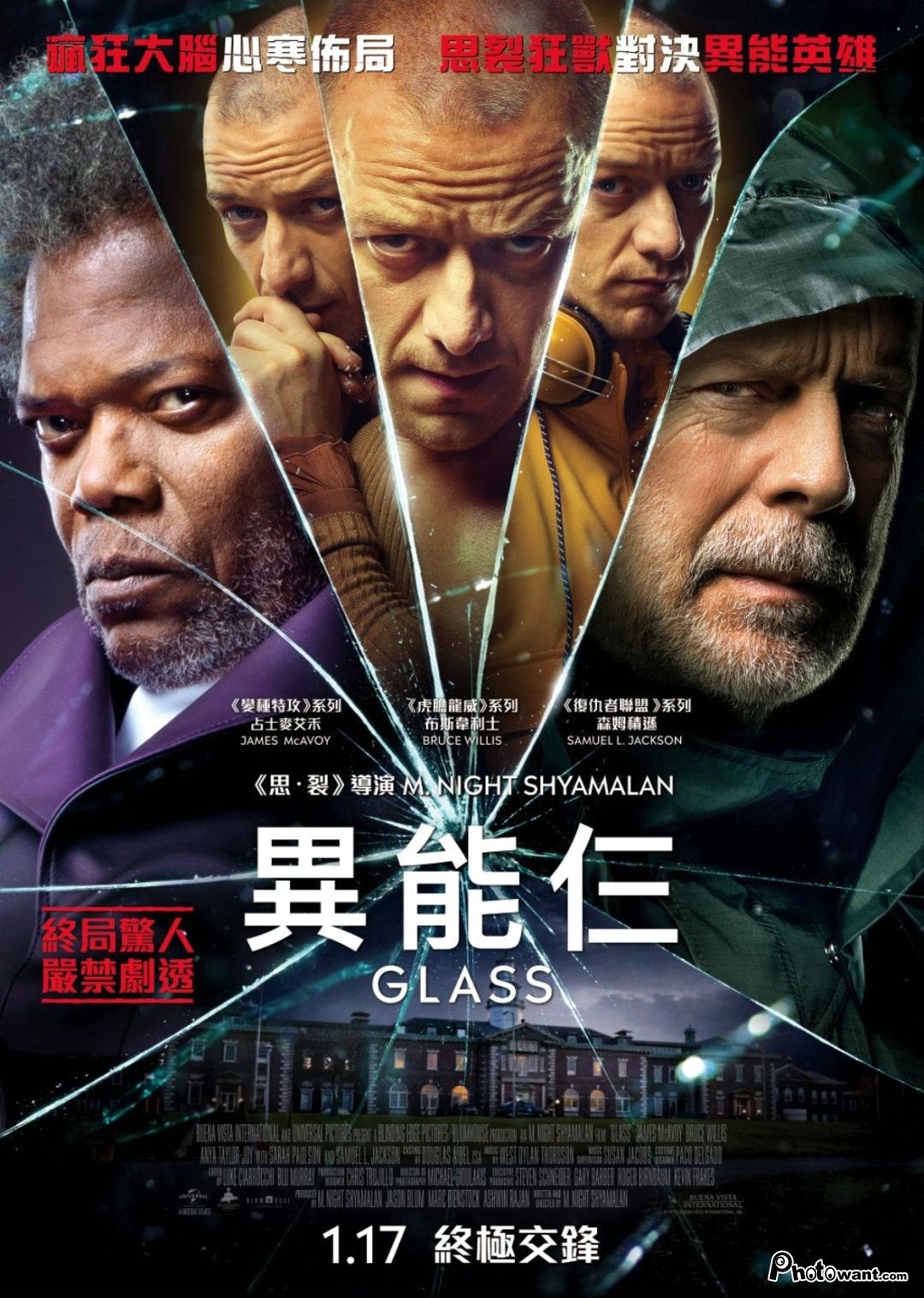 印度裔美國導演奈沙馬蘭《分裂》、《驚心動魄》共同續集,卡司布魯斯威利、山繆傑克森、詹姆斯麥艾維。描述大衛開始尋找與調查「野獸」凱文的一切,而「玻璃先生」手上則握有這兩位異能者極關鍵的秘密…
