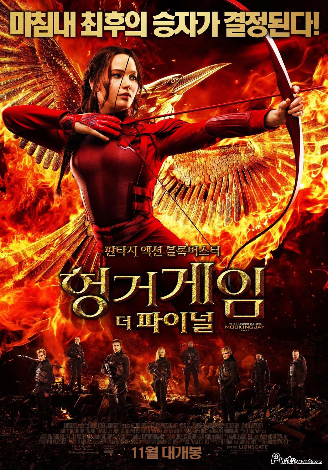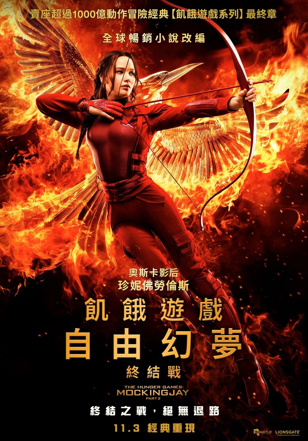 風靡全世界的賣座強片《飢餓遊戲》系列,前三集電影全球總票房創下22億美元紀錄後,即將邁入最終章。劇情接續前集,施惠國已進入全國性戰爭狀態,凱妮絲挺身對抗都城的史諾總統,決心展開最後殊死戰。